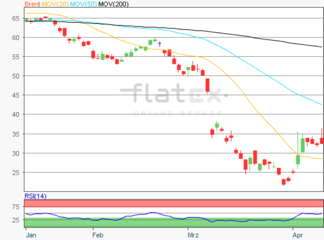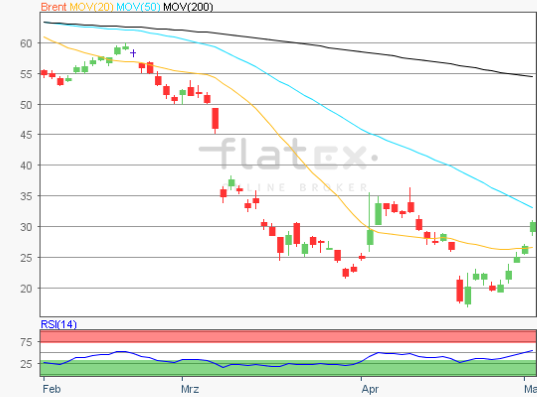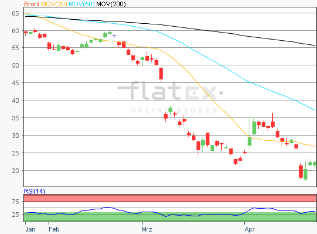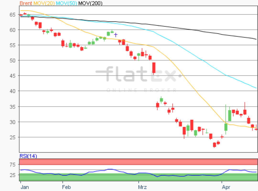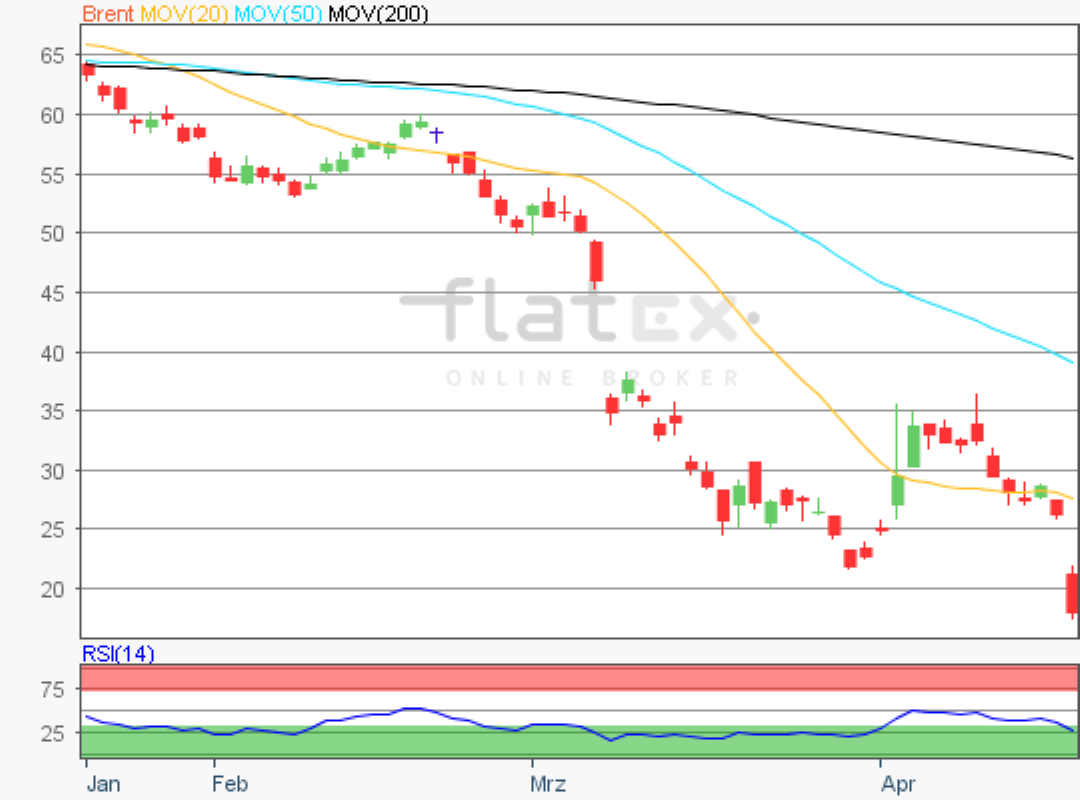 Der Preis für ein Fass Rohöl der Nordseesorte Brent im Juni-Kontrakt an der Terminbörse ICE fiel im Monat März so stark wie seit der Weltfinanzkrise nicht mehr und auch im April setzte sich die Abwärtsbewegung trotz der Vereinbarungen von Produktionskürzungen nach zwischenzeitlichen Strohfeuern weiter fort.