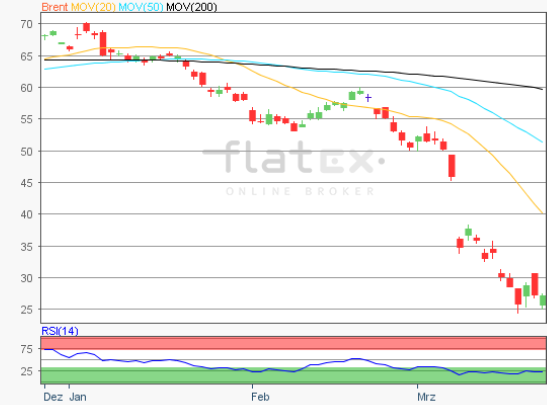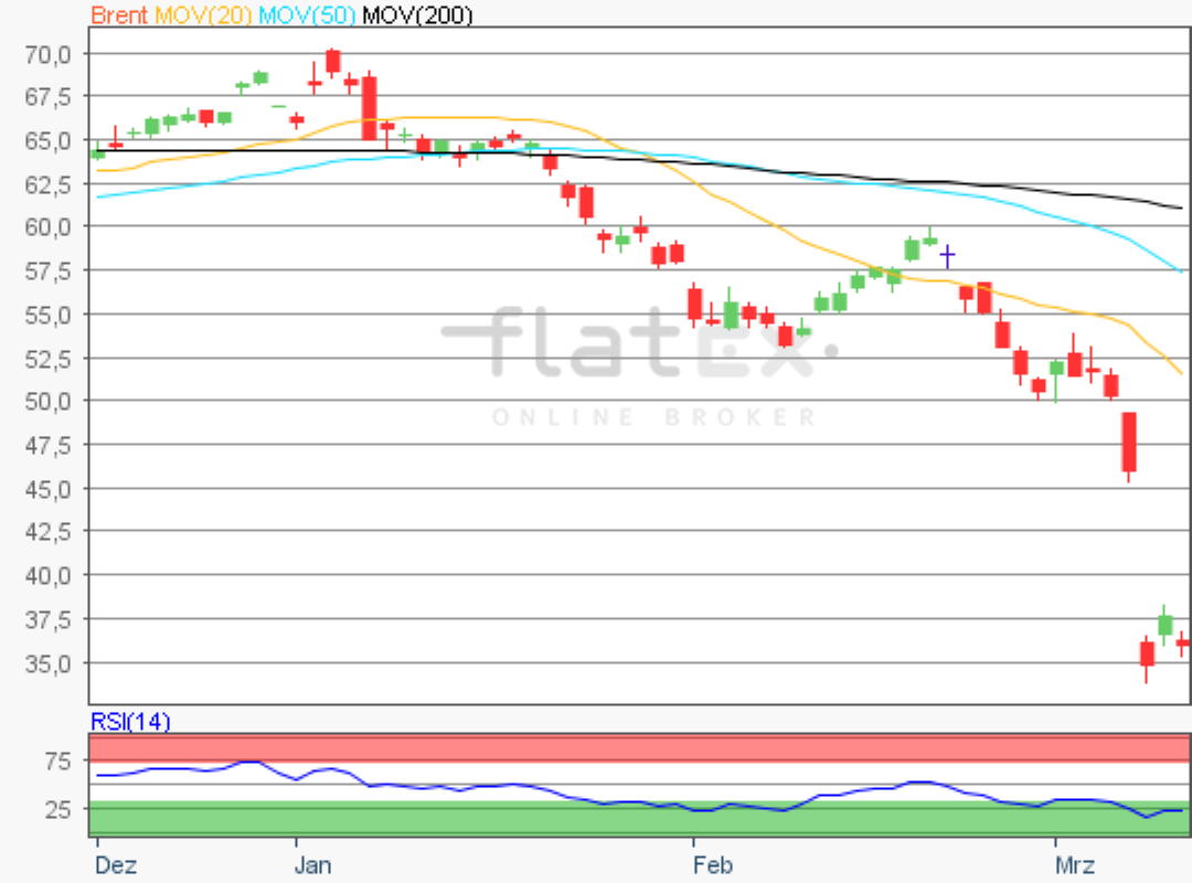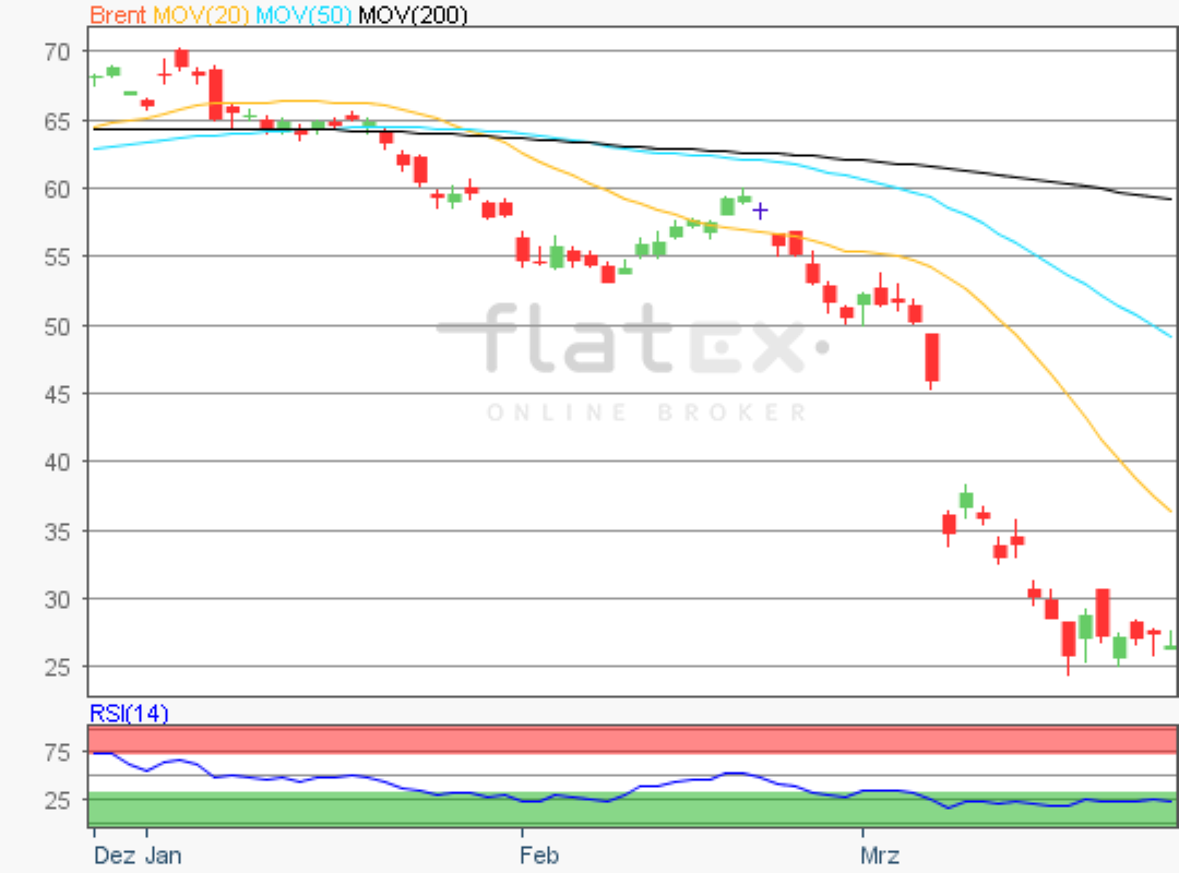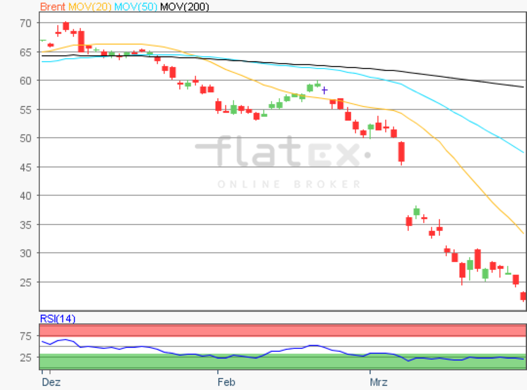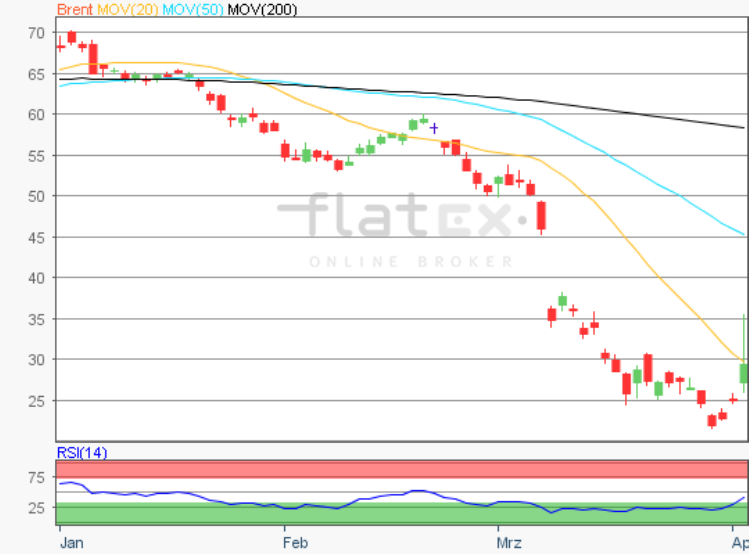 Der Preis für ein Fass Rohöl der Nordseesorte Brent im Juni-Kontrakt an der Terminbörse ICE fiel im Monat März so stark wie seit der Weltfinanzkrise nicht mehr und auch im April setzte sich die Abwärtsbewegung trotz der Vereinbarungen von Produktionskürzungen nach zwischenzeitlichen Strohfeuern weiter fort.