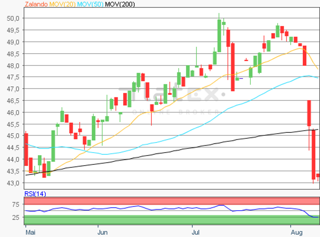 Die Aktie des MDAX-Konzerns Zalando bildete am 08. August 2018 bei 42,72 Euro ein Verlaufstief aus.