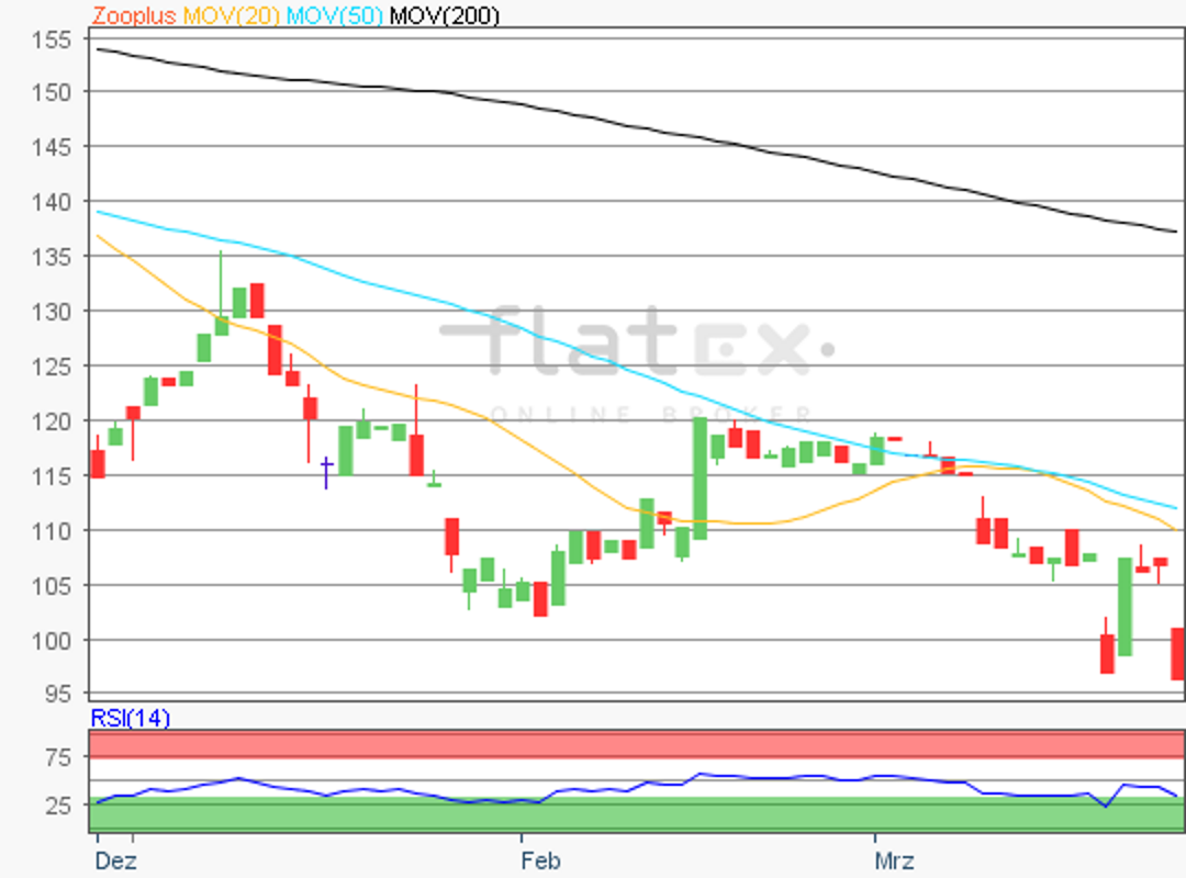 Die Aktie des SDAX-Konzerns Zooplus notierte am 25. März 2020 auf einem letzten hier relevanten Verlaufstief von 85,90 Euro.